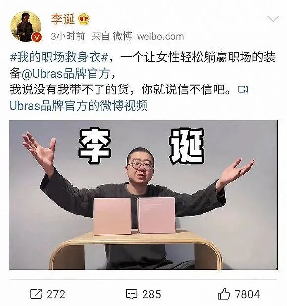 李诞为该品牌代言的广告词是:“我的职场救身衣,一个让女性轻松躺赢职场的装备。”李诞以这句话发博并@Ubras品牌官方,还在微博中写道:“我说没有我带不了的货,你就说信不信吧。”