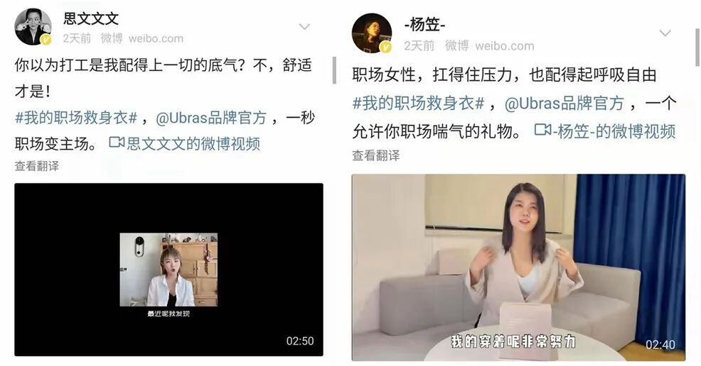 让我们再来回到品牌本身,这次Ubras的翻车,我们大概能提取出品牌本次营销原本的主题,那就是突出产品舒适好穿、无束缚的特点。也许是为了更好地触达目标消费群体,引发职场人的共鸣,Ubras将内衣产品与职场进行关联,提出了#我的职场救身衣#这一话题,并请了多位意见领袖进行推广宣传。包括近期从脱口秀节目大红的热点人物杨笠以及思文,都从自身角度将职场女性与产品无束缚的特点联系在一起,进行带货。