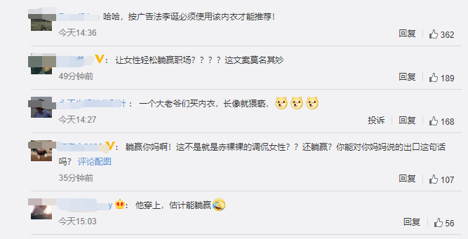 网友普遍认为,某种内衣“让女性躺赢”属于典型的物化女性,存在讽刺女性不能靠能力,而是要靠姿色上位的嫌疑。